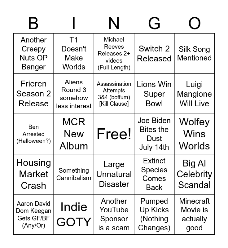 This bingo card has a free space and 24 words: Something Cannibalism, Indie GOTY, Assassination Attempts 3&4 (boffum) [Kill Clause], Aaron David Dom Keegan Gets GF/BF (Any/Or), Silk Song Mentioned, Another Creepy Nuts OP Banger, Frieren Season 2 Release, T1 Doesn't Make Worlds, Joe Biden Bites the Dust July 14th, Large Unnatural Disaster, Lions Win Super Bowl, Ben Arrested (Halloween?), Extinct Species Comes Back, Big AI Celebrity Scandal, Aliens Round 3 somehow less interest, Pumped Up Kicks (Nothing Changes), Wolfey Wins Worlds, Michael Reeves Releases 2+ videos (Full Length), Luigi Mangione Will Live, MCR New Album, Minecraft Movie is actually good, Housing Market Crash, Switch 2 Released and Another YouTube Sponsor is a scam.