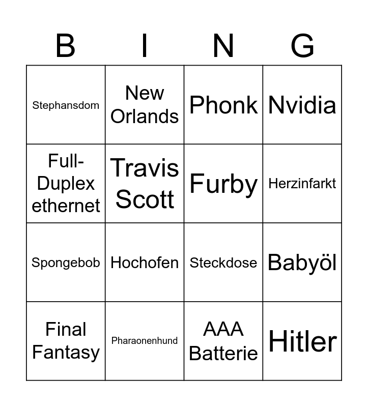 This bingo card has 16 words: Pharaonenhund, Babyöl, Phonk, Stephansdom, Spongebob, New Orlands, Steckdose, AAA Batterie, Full-Duplex ethernet, Travis Scott, Final Fantasy, Nvidia, Hochofen, Herzinfarkt, Furby and Hitler.