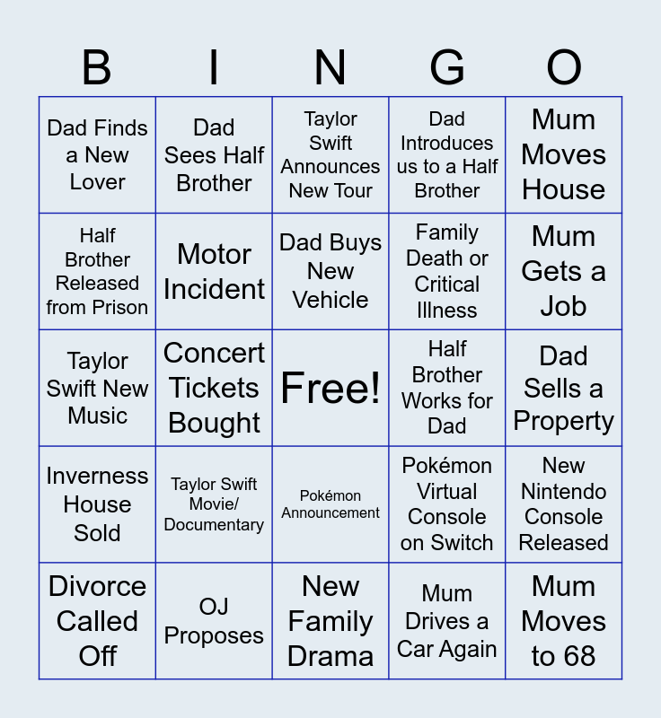 This bingo card has a free space and 24 words: Taylor Swift Movie/ Documentary, OJ Proposes, Dad Buys New Vehicle, Divorce Called Off, Mum Moves House, Dad Finds a New Lover, Half Brother Released from Prison, Dad Sees Half Brother, Half Brother Works for Dad, Pokémon Announcement, Family Death or Critical Illness, Taylor Swift New Music, Pokémon Virtual Console on Switch, New Nintendo Console Released, Motor Incident, Mum Drives a Car Again, Dad Sells a Property, Taylor Swift Announces New Tour, Mum Gets a Job, Concert Tickets Bought, Mum Moves to 68, Inverness House Sold, Dad Introduces us to a Half Brother and New Family Drama.