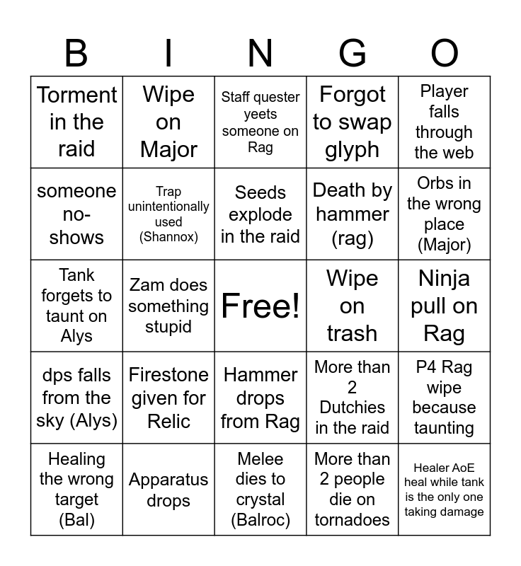 This bingo card has a free space and 34 words: Tank dies on trash, More than 2 people die on tornadoes, Wipe on Ryolith, More than 3 people die on Rag while dancing, dps falls from the sky (Alys), Trap unintentionally used (Shannox), Player falls through the web, Healing the wrong target (Bal), Wipe on Major, "Lets just clap it down on normal", Seeds explode in the raid, Staff quester yeets someone on Rag, 0 deaths Alyz, flame reaches hammer, Wipe on trash, Orbs in the wrong place (Major), Apparatus drops, Tank forgets to taunt on Alys, Firestone given for Relic, More than 2 Dutchies in the raid, Hammer drops from Rag, Mage fails cheese (Beth), Torment in the raid, Ninja pull on Rag, Melee dies to crystal (Balroc), Healer AoE heal while tank is the only one taking damage, Forgot to swap glyph, Death by lava wave (rag), Death by hammer (rag), someone no-shows, 1 shot Baleroc, Zam does something stupid, P4 Rag wipe because taunting and Someone dies on trash before rag.