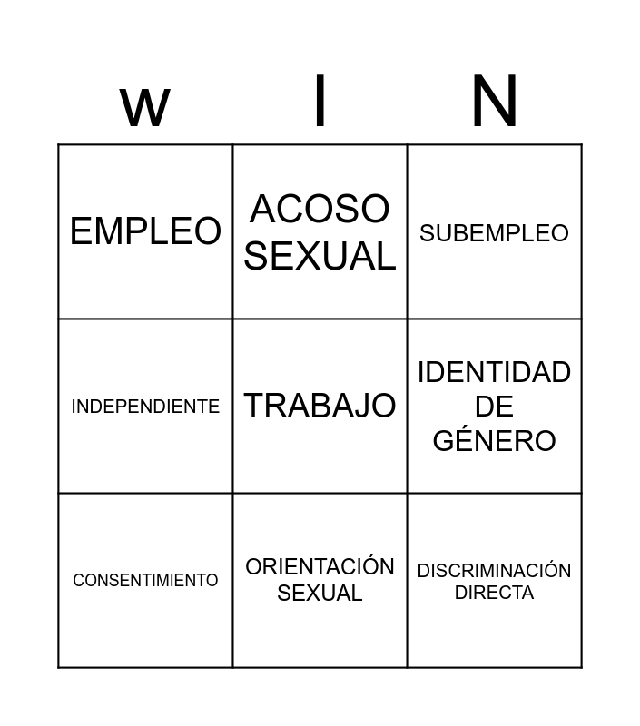 This bingo card has 41 words: Free!, GÉNERO, SEXO BIOLÓGICO, CONSENTIMIENTO, RESPONSABILIDAD AFECTIVA, FEMINISMO, ORIENTACIÓN SEXUAL, TECHO DE CRISTAL, TRABAJO, EMPLEO, ASALARIADO, INDEPENDIENTE, EMPLEADO, EMPLEADORES, TRABAJADORES POR CUENTA PROPIA, MIEMBROS DE COOPERATIVAS DE PRODUCCIÓN, TRABAJADORES FAMILIARES AUXILIARES, EMPLEO, DESEMPLEO, SUBEMPLEO, OCUPADOS, PARADOS, INACTIVOS, DISCRIMINACIÓN DIRECTA, DISCRIMINACIÓN INDIRECTA, SEGREGACIÓN HORIZONTAL, SEGREGACIÓN VERTICAL, BRECHA SALARIAL, SALARIO, RETRIBUCIÓN, ACOSO POR RAZÓN DE SEXO, ACOSO SEXUAL, XENOFOBIA, PREJUICIO, ESTEREOTIPOS, IDENTIDAD DE GÉNERO, GRUPO SOCIAL, AUTOCONCEPTO, AUTOESTIMA, AUTOEFICACIA and ACTITUD.