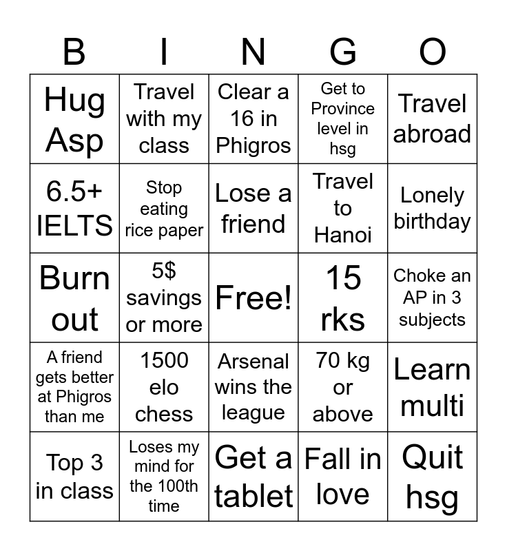 This bingo card has a free space and 24 words: 1500 elo chess, Loses my mind for the 100th time, Lose a friend, Top 3 in class, Travel abroad, Hug Asp, 6.5+ IELTS, Travel with my class, 15 rks, Arsenal wins the league, Travel to Hanoi, Burn out, 70 kg or above, Learn multi, Stop eating rice paper, Fall in love, Choke an AP in 3 subjects, Clear a 16 in Phigros, Lonely birthday, 5$ savings or more, Quit hsg, A friend gets better at Phigros than me, Get to Province level in hsg and Get a tablet.