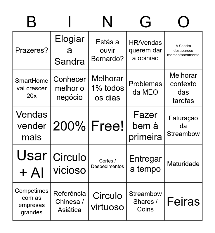 This bingo card has a free space and 31 words: Circulo virtuoso, Vamos ficar ricos, 200%, Alguém liga para o suporte, Prazeres?, Estás a ouvir Bernardo?, Conhecer melhor o negócio, Entregar a tempo, Fazer bem à primeira, Streambow Shares / Coins, Faturação da Streambow, Feiras, Ler um livro de self-improvement, Vídeo motivacional, Melhorar contexto das tarefas, Anibal vê o móvel depois de pedir uma opinião, Maturidade, Circulo vicioso, Usar + AI, Cortes / Despedimentos, A Sandra desaparece momentaneamente, O Aníbal conta uma história com pelo menos 15 anos, Competimos com as empresas grandes, Elogiar a Sandra, Problemas da MEO, SmartHome vai crescer 20x, HR/Vendas querem dar a opinião, Vendas vender mais, Referência Chinesa / Asiática, Melhorar 1% todos os dias and XCellsite à frente do seu tempo.