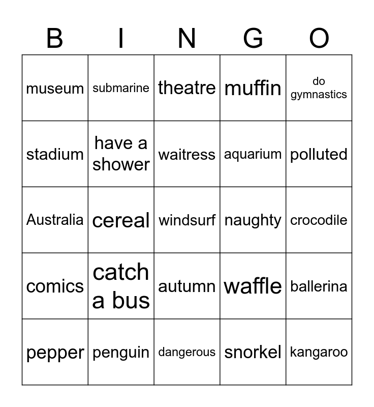 This bingo card has a free space and 29 words: pepper, cucumber, cereal, library, museum, theatre, have a shower, catch a bus, naughty, penguin, crocodile, kangaroo, dangerous, snorkel, polluted, badges, autumn, comics, do gymnastics, Australia, waffle, pudding, aquarium, stadium, muffin, submarine, ballerina, waitress and asparagus.