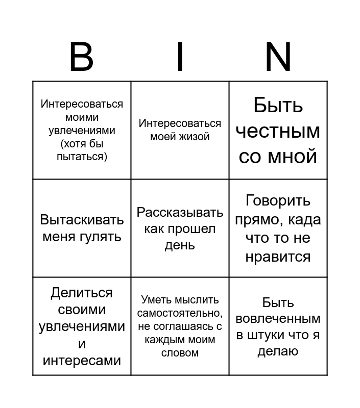 This bingo card has a free space and 8 words: Говорить прямо, када что то не нравится, Быть честным со мной, Интересоваться моей жизой, Делиться своими увлечениями и интересами, Интересоваться моими увлечениями (хотя бы пытаться), Быть вовлеченным в штуки что я делаю, Вытаскивать меня гулять and Уметь мыслить самостоятельно, не соглашаясь с каждым моим словом.