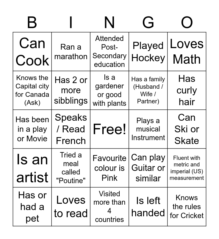 This bingo card has a free space and 29 words: Has or had a pet, Can whistle "Oh Canada", Speaks / Read French, Can sew, Can Cook, Attended Post-Secondary education, Has 2 or more sibblings, Tried a meal called "Poutine", Plays a musical Instrument, Loves to read, Can Ski or Skate, Knows the rules for Cricket, Visited more than 4 countries, Is left handed, Has curly hair, Lives more than 50 km from the College, Favourite colour is Pink, Is an artist, Loves Math, Has been in a play or Movie, Can play Guitar or similar, Loves cold weather, Has a family (Husband / Wife / Partner), Knows the Capital city for Canada (Ask), Played Hockey, Ran a marathon, Fluent with metric and imperial (US) measurement, Is a gardener or good with plants and Can tell you the value of PI, to the 5th decimal.