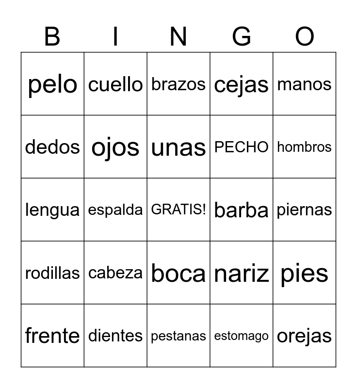 This bingo card has a free space and 24 words: cabeza, dientes, unas, frente, manos, pelo, dedos, cuello, barba, boca, PECHO, lengua, nariz, pies, ojos, estomago, piernas, brazos, hombros, espalda, orejas, rodillas, cejas and pestanas.