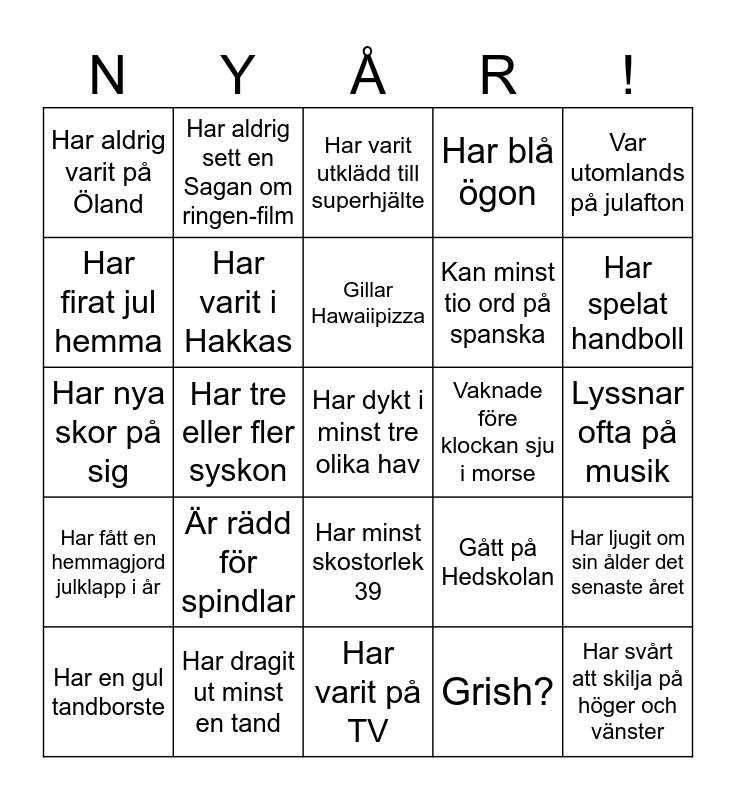This bingo card has a free space and 24 words: Är rädd för spindlar, Har dragit ut minst en tand, Gillar Hawaiipizza, Har en gul tandborste, Var utomlands på julafton, Har aldrig varit på Öland, Har firat jul hemma, Har aldrig sett en Sagan om ringen-film, Vaknade före klockan sju i morse, Har minst skostorlek 39, Kan minst tio ord på spanska, Har nya skor på sig, Gått på Hedskolan, Har ljugit om sin ålder det senaste året, Har varit i Hakkas, Grish?, Lyssnar ofta på musik, Har varit utklädd till superhjälte, Har spelat handboll, Har tre eller fler syskon, Har svårt att skilja på höger och vänster, Har fått en hemmagjord julklapp i år, Har blå ögon and Har varit på TV.