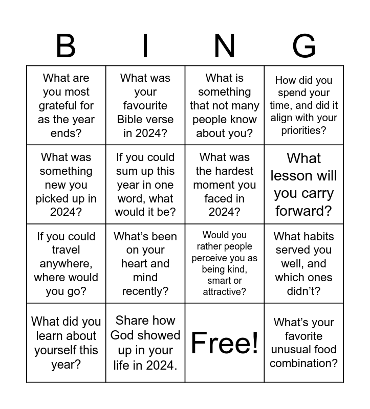 This bingo card has 17 words: Free!, What did you learn about yourself this year?, What is something that not many people know about you?, What are you most grateful for as the year ends?, What’s been on your heart and mind recently?, How did you spend your time, and did it align with your priorities?, What habits served you well, and which ones didn’t?, What was the hardest moment you faced in 2024?, What lesson will you carry forward?, If you could sum up this year in one word, what would it be?, Share how God showed up in your life in 2024., Would you rather people perceive you as being kind, smart or attractive?, What was something new you picked up in 2024?, What was your favourite Bible verse in 2024?, If you could travel anywhere, where would you go?, Describe your perfect day. and What’s your favorite unusual food combination?.