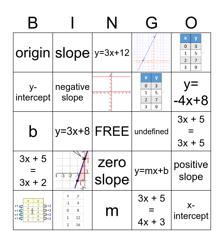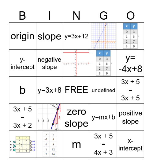 This bingo card has 7 images, a free space and 17 words: origin, y-intercept, slope, undefined, zero slope, b, y=mx+b, positive slope, negative slope, 3x + 5 = 4x + 3, 3x + 5 = 3x + 5, y=3x+12, y= -4x+8, y=3x+8, x-intercept, 3x + 5 = 3x + 2 and m.