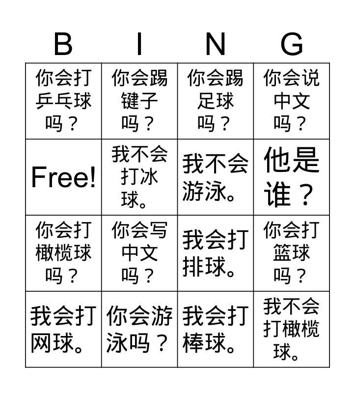 This bingo card has 16 words: 你会游泳吗?, 你会打篮球吗?, 你会踢足球吗?, 你会打乒乓球吗?, 你会打橄榄球吗?, 你会踢键子吗?, 我会打排球。, 我会打棒球。, Free!, 我不会打冰球。, 我会打网球。, 你会说中文吗?, 你会写中文吗?, 他是谁?, 我不会游泳。 and 我不会打橄榄球。.