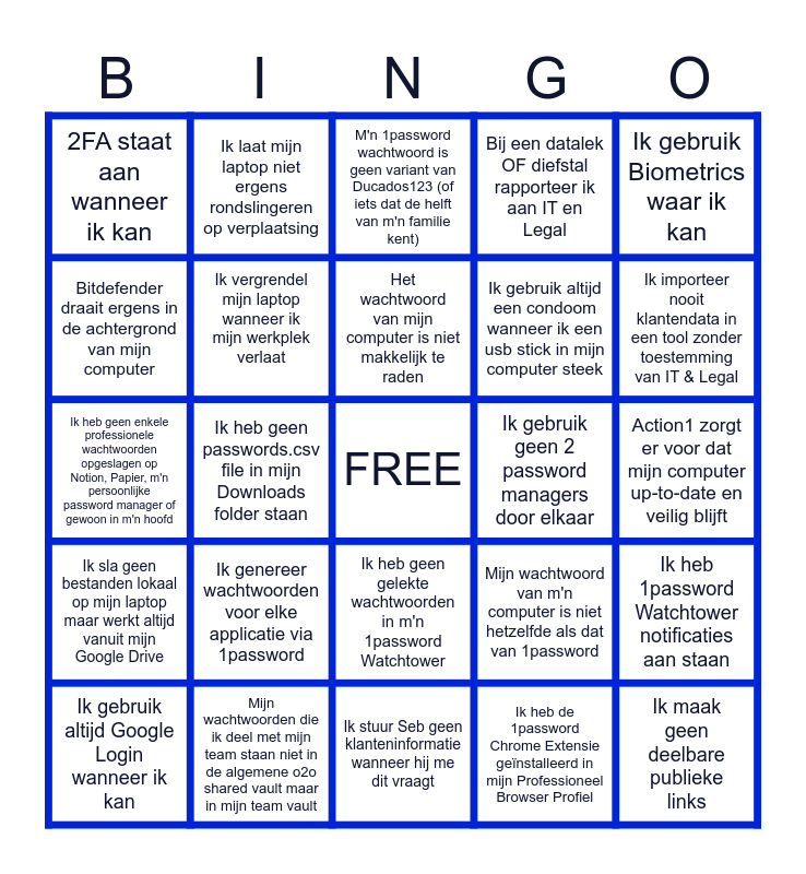 This bingo card has a free space and 24 words: Ik genereer wachtwoorden voor elke applicatie via 1password, Mijn wachtwoorden die ik deel met mijn team staan niet in de algemene o2o shared vault maar in mijn team vault, Het wachtwoord van mijn computer is niet makkelijk te raden, Ik gebruik altijd Google Login wanneer ik kan, Ik gebruik Biometrics waar ik kan, 2FA staat aan wanneer ik kan, Bitdefender draait ergens in de achtergrond van mijn computer, Ik laat mijn laptop niet ergens rondslingeren op verplaatsing, Ik gebruik geen 2 password managers door elkaar, Ik heb geen gelekte wachtwoorden in m'n 1password Watchtower, Ik gebruik altijd een condoom wanneer ik een usb stick in mijn computer steek, Ik heb geen enkele professionele wachtwoorden opgeslagen op Notion, Papier, m'n persoonlijke password manager of gewoon in m'n hoofd, Mijn wachtwoord van m'n computer is niet hetzelfde als dat van 1password, Ik heb 1password Watchtower notificaties aan staan, Ik vergrendel mijn laptop wanneer ik mijn werkplek verlaat, Ik heb de 1password Chrome Extensie geïnstalleerd in mijn Professioneel Browser Profiel, Action1 zorgt er voor dat mijn computer up-to-date en veilig blijft, M'n 1password wachtwoord is geen variant van Ducados123 (of iets dat de helft van m'n familie kent), Ik importeer nooit klantendata in een tool zonder toestemming van IT & Legal, Ik heb geen passwords.csv file in mijn Downloads folder staan, Ik maak geen deelbare publieke links, Ik sla geen bestanden lokaal op mijn laptop maar werkt altijd vanuit mijn Google Drive, Bij een datalek OF diefstal rapporteer ik aan IT en Legal and Ik stuur Seb geen klanteninformatie wanneer hij me dit vraagt.
