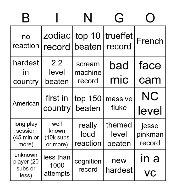This bingo card has a free space and 29 words: unknown player (20 subs or less), rust record, first in country, really loud clicks, no reaction, top 10 beaten, 2.2 level beaten, well known (10k subs or more), massive fluke, less than 1000 attempts, NC level, in a vc, cognition record, new hardest, face cam, default cube, really loud reaction, long play session (45 min or more), French, American, themed level beaten, top 40 to 50 level, bad mic, hardest in country, trueffet record, zodiac record, jesse pinkman record, scream machine record and renevant record.