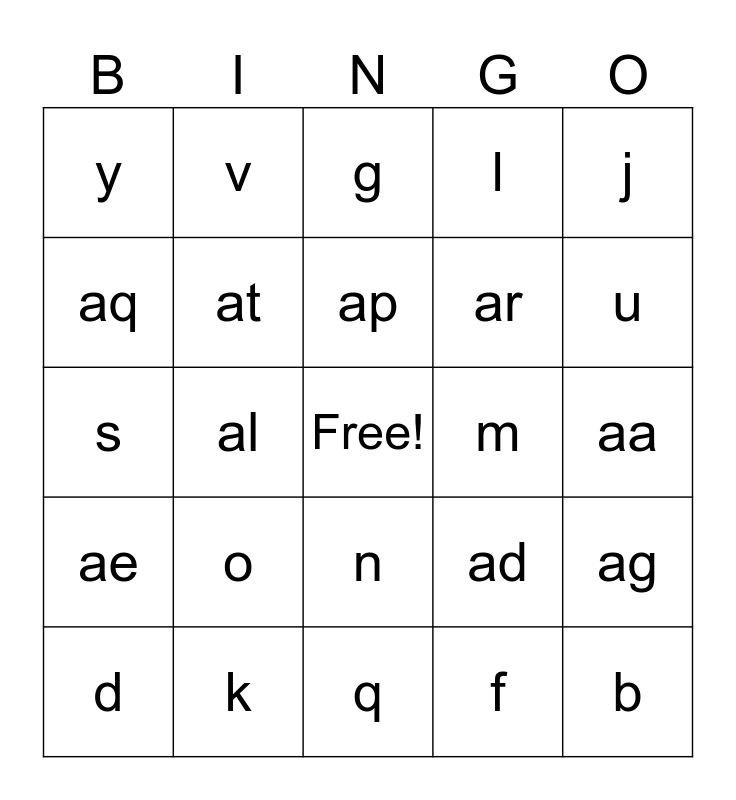 This bingo card has a free space and 45 words: a, b, c, d, e, f, g, h, j, k, l, m, n, o, p, q, r, s, t, u, v, w, x, y, z, aa, ab, ac, ad, ae, af, ag, ah, aj, ak, al, am, an, ao, ap, aq, ar, as, at and av.