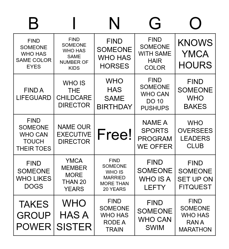 This bingo card has a free space and 24 words: YMCA MEMBER MORE THAN 20 YEARS, WHO HAS A SISTER, WHO HAS SAME BIRTHDAY, TAKES GROUP POWER, KNOWS YMCA HOURS, FIND SOMEONE WHO HAS SAME COLOR EYES, FIND A LIFEGUARD, FIND SOMEONE WHO HAS SAME NUMBER OF KIDS, NAME A SPORTS PROGRAM WE OFFER, FIND SOMEONE WHO IS MARRIED MORE THAN 20 YEARS, FIND SOMEONE WHO CAN DO 10 PUSHUPS, FIND SOMEONE WHO CAN TOUCH THEIR TOES, FIND SOMEONE WHO IS A LEFTY, FIND SOMEONE SET UP ON FITQUEST, WHO IS THE CHILDCARE DIRECTOR, FIND SOMEONE WHO CAN SWIM, WHO OVERSEES LEADERS CLUB, FIND SOMEONE WHO HAS HORSES, FIND SOMEONE WHO BAKES, NAME OUR EXECUTIVE DIRECTOR, FIND SOMEONE WHO HAS RAN A MARATHON, FIND SOMEONE WHO LIKES DOGS, FIND SOMEONE WITH SAME HAIR COLOR and FIND SOMEONE WHO HAS RODE A TRAIN.