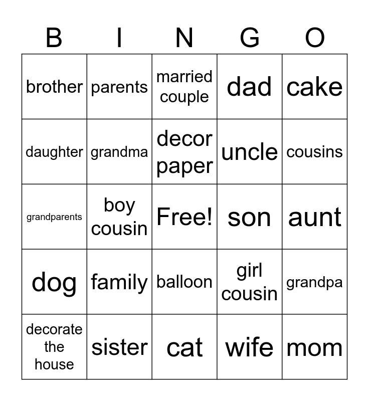 This bingo card has a free space and 24 words: family, sister, decor paper, decorate the house, cake, brother, daughter, parents, son, balloon, uncle, grandparents, girl cousin, grandpa, grandma, wife, aunt, married couple, cousins, boy cousin, mom, dog, dad and cat.