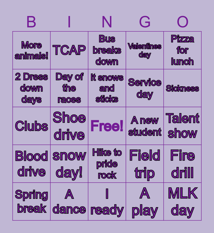 This bingo card has a free space and 24 words: snow day!, A dance, It snows and sticks, Spring break, Pizza for lunch, More animals!, 2 Dress down days, TCAP, A new student, Hike to pride rock, Service day, Clubs, Field trip, Fire drill, Day of the races, A play, Talent show, Bus breaks down, Sickness, Shoe drive, MLK day, Blood drive, Valentines day and I ready.