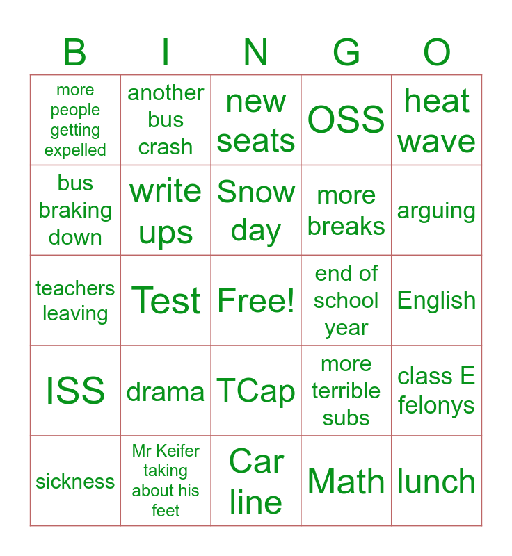 This bingo card has a free space and 24 words: drama, Mr Keifer taking about his feet, Snow day, sickness, heat wave, more people getting expelled, bus braking down, another bus crash, end of school year, TCap, more breaks, teachers leaving, more terrible subs, class E felonys, write ups, Math, English, new seats, arguing, Test, lunch, ISS, OSS and Car line.