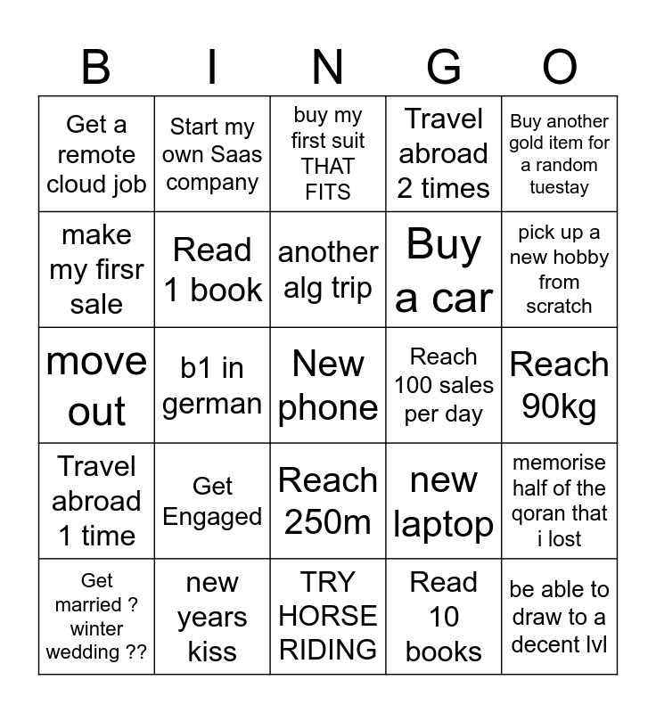 This bingo card has a free space and 24 words: Get Engaged, new years kiss, another alg trip, Get married ? winter wedding ??, Buy another gold item for a random tuestay, Get a remote cloud job, make my firsr sale, Start my own Saas company, Reach 100 sales per day, Reach 250m, Buy a car, move out, new laptop, memorise half of the qoran that i lost, Read 1 book, Read 10 books, Reach 90kg, buy my first suit THAT FITS, pick up a new hobby from scratch, b1 in german, be able to draw to a decent lvl, Travel abroad 1 time, Travel abroad 2 times and TRY HORSE RIDING.