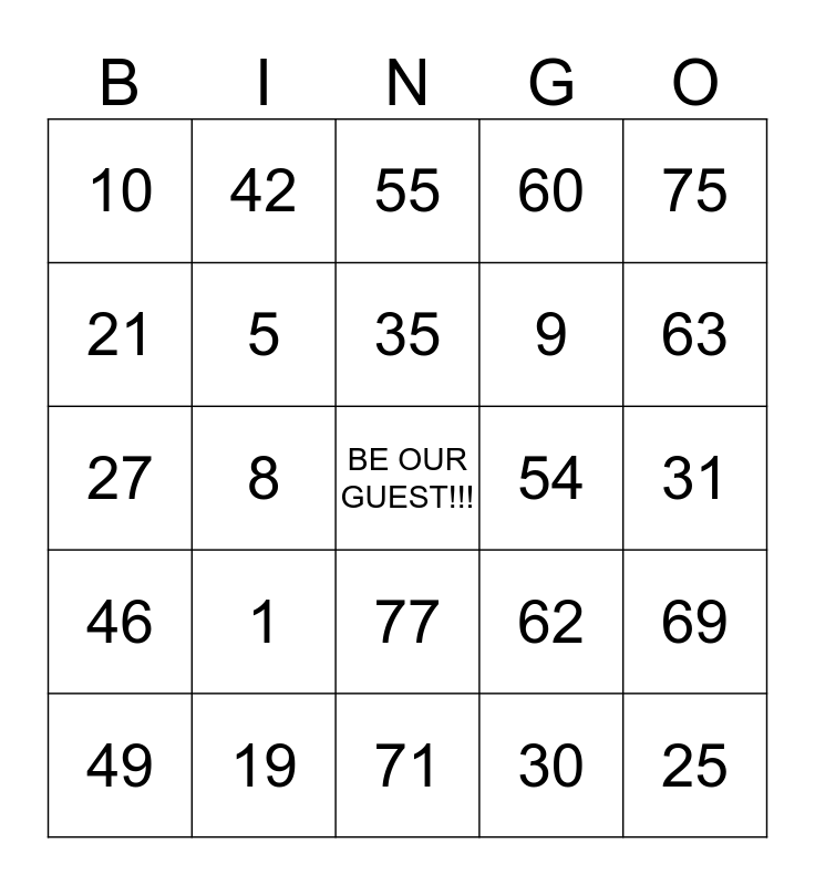 This bingo card has a free space and 24 words: 1, 19, 35, 49, 75, 10, 21, 42, 54, 77, 9, 27, 62, 69, 5, 30, 31, 55, 63, 8, 25, 46, 60 and 71.