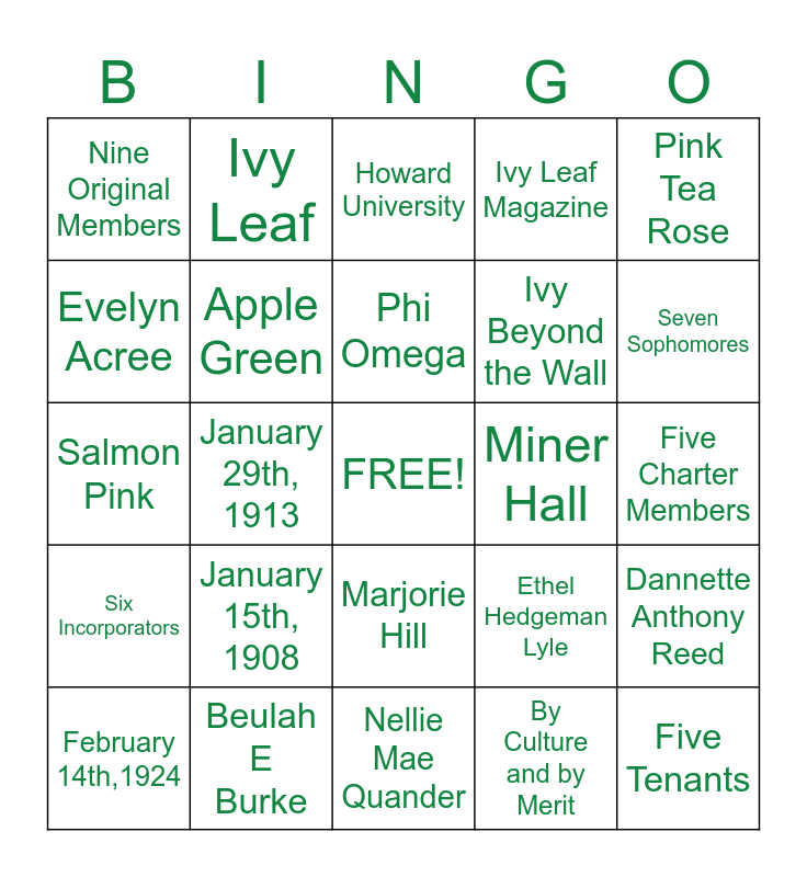 This bingo card has a free space and 24 words: February 14th,1924, January 15th, 1908, Phi Omega, By Culture and by Merit, Pink Tea Rose, Nine Original Members, Ivy Leaf, Howard University, Miner Hall, Five Charter Members, Salmon Pink, Apple Green, Ethel Hedgeman Lyle, Dannette Anthony Reed, Evelyn Acree, Beulah E Burke, Nellie Mae Quander, Ivy Leaf Magazine, Seven Sophomores, Six Incorporators, January 29th, 1913, Marjorie Hill, Ivy Beyond the Wall and Five Tenants.
