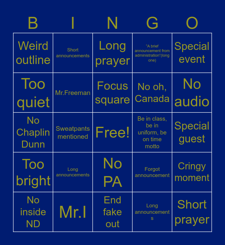 This bingo card has a free space and 24 words: Long announcements, Mr.I, Focus square, No inside ND, Special event, Weird outline, Too quiet, Short announcements, Be in class, be in uniform, be on time motto, No PA, No oh, Canada, No Chaplin Dunn, Forgot announcement, Cringy moment, Mr.Freeman, Long announcement s, Special guest, Long prayer, No audio, Sweatpants mentioned, Short prayer, Too bright, “A brief announcement from administration”(long one) and End fake out.