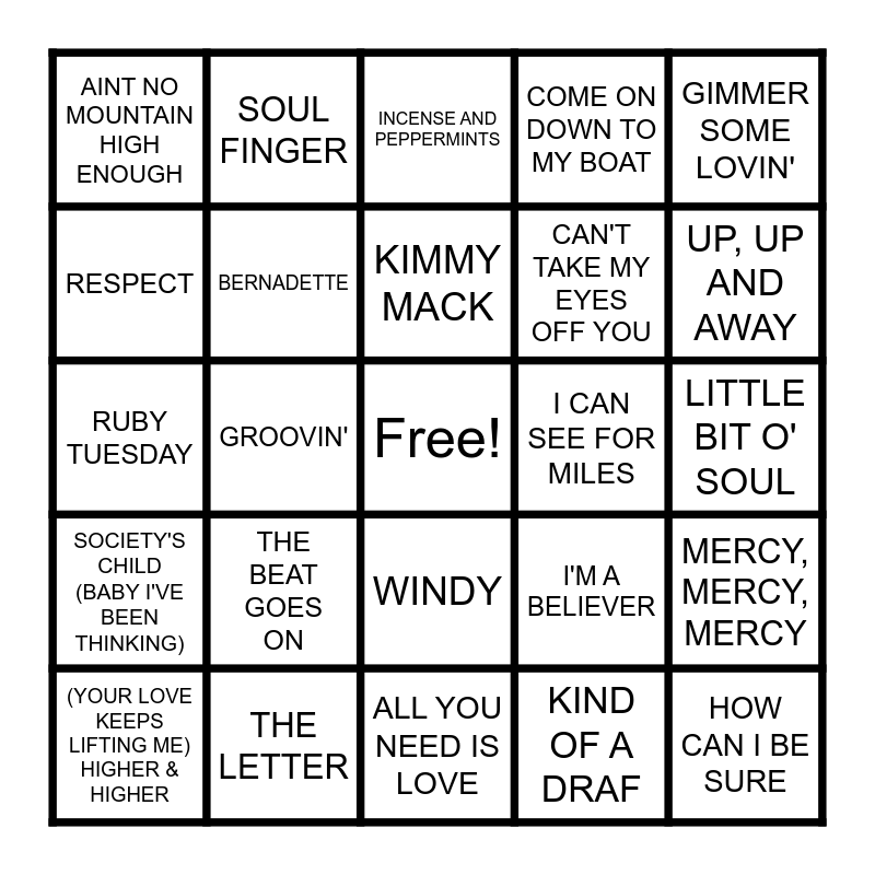 This bingo card has a free space and 55 words: 98.6, (YOUR LOVE KEEPS LIFTING ME) HIGHER & HIGHER, A WHITER SHADE OF PALE, AINT NO MOUNTAIN HIGH ENOUGH, ALL YOU NEED IS LOVE, APPLES, PEACHES, PUMPKIN PIE, BERNADETTE, BROWN EYED GIRL, CAN'T TAKE MY EYES OFF YOU, CARRIE-ANNE, COME ON DOWN TO MY BOAT, DON’T SLEEP IN THE SUBWAY, EVERLASTING LOVE, FOR WHAT IT'S WORTH, FRIDAY ON MY MIND, GEORGY GIRL, GIMMER SOME LOVIN', GROOVIN', HAPPY TOGETHER, HOW CAN I BE SURE, I CAN SEE FOR MILES, I THINK WE'RE ALONE NOW, I'M A BELIEVER, INCENSE AND PEPPERMINTS, I'VE BEEN LONELY TOO LONG, KIMMY MACK, KIND OF A DRAF, LIGHT MY FIRE, LITTLE BIT O' SOUL, MERCY, MERCY, MERCY, ODE TO BILLIE JOE, PLEASANY VALLEY SUNDAY, REFLECTIONS, RELEASE ME, RESPECT, RUBY TUESDAY, SAN FRANCISCO (BE SURE TO WEAR SOME FLOWERS IN YOUR HAIR, SOCIETY'S CHILD (BABY I'VE BEEN THINKING), SOMEBODY TO LOVE, SOMETHIN; STUPID, SOUL FINGER, SOUL MAN, SWEET SOUL MUSIC, THANK THE LORD FOR THE NIGHT TIME, THE BEAT GOES ON, THE LETTER, THE RAIN THE PARK AND OTHER THINGS, THERE'S A KIND OF HUSH, TO SIR WITH LOVE, UP, UP AND AWAY, WE AIN'T GOT NOTHIN' YET, WESTERN UNION, WHITE RABBIT, WINDY and YOU'RE MY EVERYTHING.