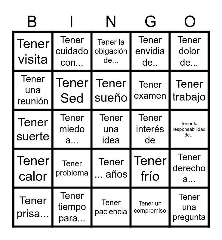 This bingo card has 36 words: Free!, Tener invitados, Tener hambre, Tener Sed, Tener frío, Tener calor, Tener sueño, Tener fiebre, Tener dolor de..., Tener una enfermedad, Tener miedo a..., Tener envidia de.., Tener celos de..., Tener interés de, Tener trabajo, Tener visita, Tener una pregunta, Tener problema, Tener una idea, Tener la obigación de..., Tener la responsabilidad de..., Tener derecho a..., Tener tiempo para..., Tener prisa..., Tener paciencia, Tener cuidado con..., Tener suerte, Tener clase, Tener examen, Tener una reunión, Tener una fiesta, Tener una cita, Tener un compromiso, Tener ... años, Tener lugar and Tener que + infinitivo.