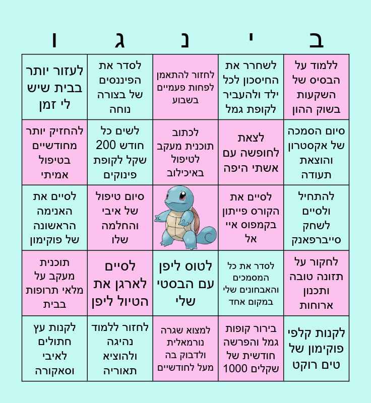 This bingo card has a free space and 24 words: לסיים לארגן את הטיול ליפן, לחזור ללמוד נהיגה ולהוציא תאוריה, לכתוב תוכנית מעקב לטיפול באיכילוב, לקנות עץ חתולים לאיבי וסאקורה, ללמוד על הבסיס של השקעות בשוק ההון, לעזור יותר בבית שיש לי זמן, להחזיק יותר מחודשיים בטיפול אמיתי, לסדר את הפיננסים של בצורה נוחה, לסיים את הקורס פייתון בקמפוס איי אל, לטוס ליפן עם הבסטי שלי, לצאת לחופשה עם אשתי היפה, לסיים את האנימה הראשונה של פוקימון, לסדר את כל המסמכים והאבחונים שלי במקום אחד, לחקור על תזונה טובה ותכנון ארוחות, לשים כל חודש 200 שקל לקופת פינוקים, בירור קופות גמל והפרשה חודשית של 1000 שקלים, להתחיל ולסיים לשחק סייברפאנק, לחזור להתאמן לפחות פעמיים בשבוע, סיום הסמכה של אקסטרון והוצאת תעודה, סיום טיפול של איבי והחלמה שלו, לקנות קלפי פוקימון של טים רוקט, תוכנית מעקב על מלאי תרופות בבית, לשחרר את החיסכון לכל ילד ולהעביר לקופת גמל and למצוא שגרה נורמאלית ולדבוק בה מעל לחודשיים.
