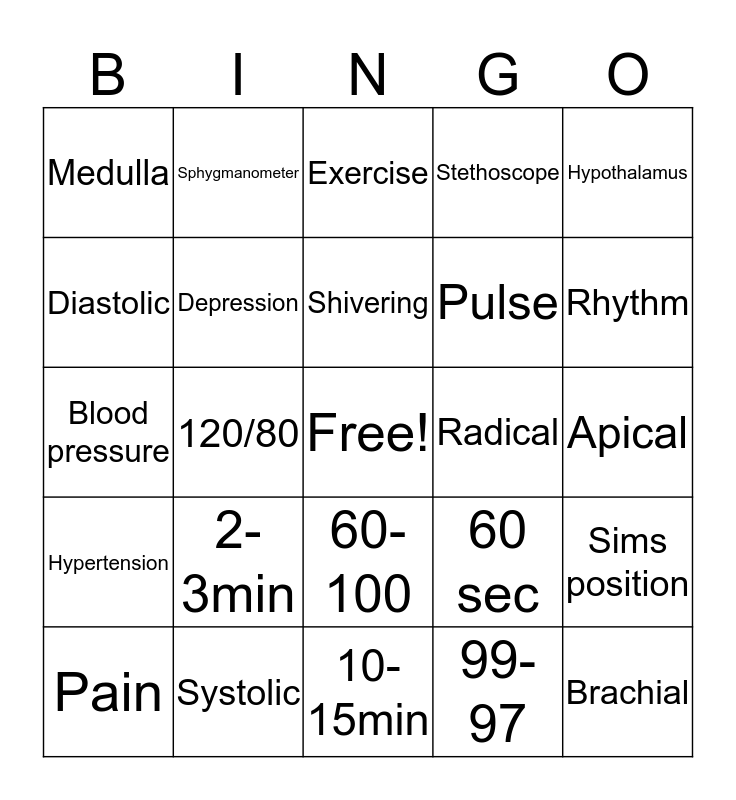 This bingo card has a free space and 24 words: 2-3min, Systolic, Shivering, Pain, Hypothalamus, Medulla, Diastolic, Sphygmanometer, Radical, 60-100, Pulse, Blood pressure, 60 sec, Sims position, Depression, 99-97, Apical, Exercise, Rhythm, 120/80, Brachial, Hypertension, Stethoscope and 10-15min.