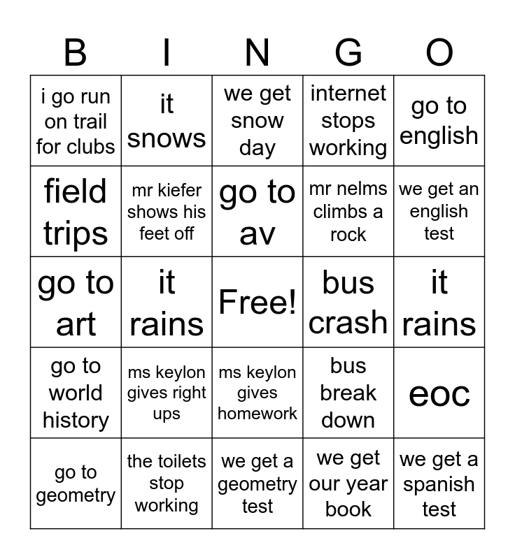 This bingo card has a free space and 24 words: ms keylon gives right ups, the toilets stop working, go to av, go to geometry, go to english, i go run on trail for clubs, field trips, it snows, bus crash, ms keylon gives homework, mr nelms climbs a rock, go to art, bus break down, eoc, mr kiefer shows his feet off, we get our year book, it rains, we get snow day, we get an english test, it rains, we get a spanish test, go to world history, internet stops working and we get a geometry test.