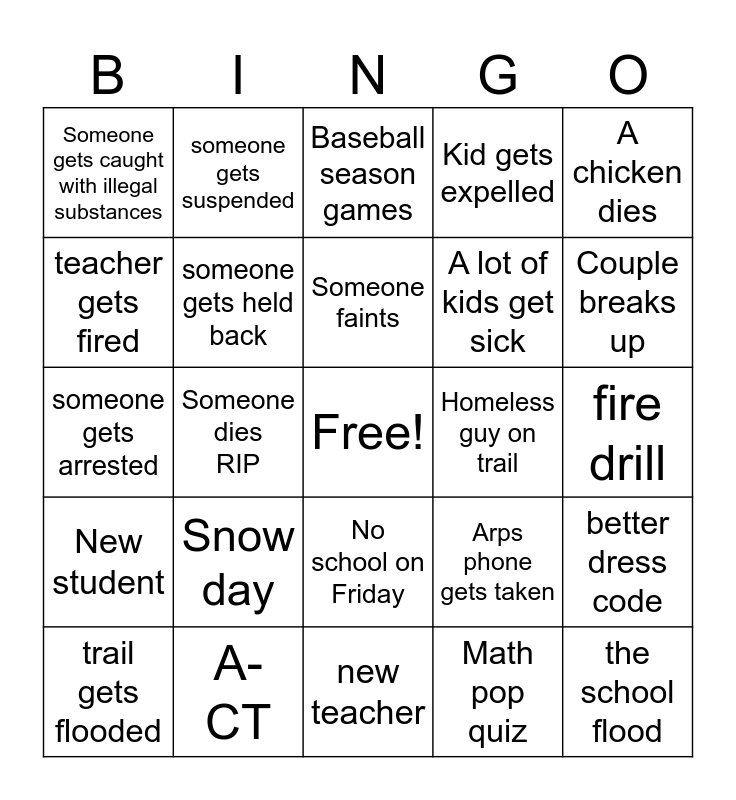 This bingo card has a free space and 24 words: Snow day, A-CT, Someone faints, trail gets flooded, A chicken dies, Someone gets caught with illegal substances, teacher gets fired, someone gets suspended, Homeless guy on trail, No school on Friday, A lot of kids get sick, someone gets arrested, Arps phone gets taken, better dress code, someone gets held back, Math pop quiz, fire drill, Baseball season games, Couple breaks up, Someone dies RIP, the school flood, New student, Kid gets expelled and new teacher.