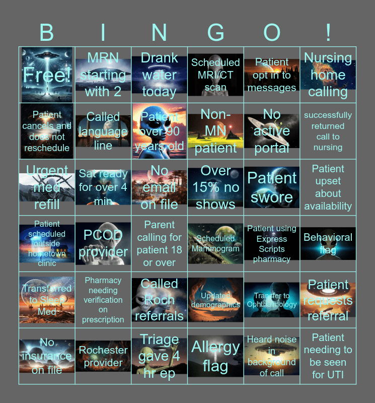 This bingo card has 31 images and 36 words: Updated demographics, Called Roch referrals, Allergy flag, Patient cancels and does not reschedule, Patient scheduled outside hometown clinic, Over 15% no shows, Called language line, Triage gave 4 hr ep, Patient opt in to messages, Transfer to Ophthalmology, successfully returned call to nursing, Scheduled MRI/CT scan, Patient requests referral, Sat ready for over 4 min, Non-MN patient, Free!, Transferred to Sleep Med, Patient swore, Urgent med refill, Drank water today, No email on file, PCOD provider, Scheduled Mammogram, Parent calling for patient 18 or over, Patient using Express Scripts pharmacy, MRN starting with 2, No active portal, Rochester provider, Patient over 90 years old, Nursing home calling, Patient needing to be seen for UTI, No insurance on file, Behavioral flag, Patient upset about availability, Pharmacy needing verification on prescription and Heard noise in background of call.