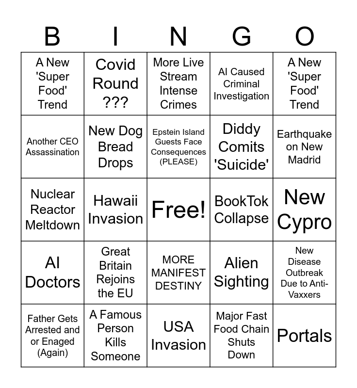 This bingo card has a free space and 24 words: Great Britain Rejoins the EU, A Famous Person Kills Someone, Epstein Island Guests Face Consequences (PLEASE), Father Gets Arrested and or Enaged (Again), A New 'Super Food' Trend, A New 'Super Food' Trend, Another CEO Assassination, Covid Round ???, BookTok Collapse, MORE MANIFEST DESTINY, Diddy Comits 'Suicide', Nuclear Reactor Meltdown, Alien Sighting, New Disease Outbreak Due to Anti-Vaxxers, New Dog Bread Drops, Major Fast Food Chain Shuts Down, New Cypro, More Live Stream Intense Crimes, Earthquake on New Madrid, Hawaii Invasion, Portals, AI Doctors, AI Caused Criminal Investigation and USA Invasion.