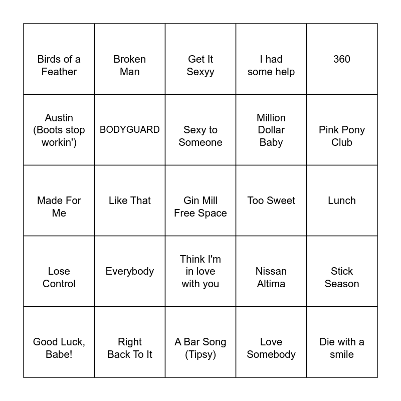 This bingo card has a free space and 57 words: Not Like Us, Good Luck, Babe!, Espresso, Birds of a Feather, A Bar Song (Tipsy), Girl, so confusing, BODYGUARD, Diet Pepsi, Million Dollar Baby, Fornight, I had some help, Sticky, We can't be friends, Nasty, Please Please Please, TGIF, 360, Like That, Texas Hold 'Em, Die with a smile, Too Sweet, Saturn, Nissan Altima, Get It Sexyy, Beautiful Things, Sexy to Someone, Deeper Well, Fisherrr, Pink Pony Club, Don't forget me, Love me JeJe, Cinderella, Ain't no love in Oklahoma, That's so true, Lunch, Austin (Boots stop workin'), End of Beginning, Made For Me, HISS, Lose Control, Broken Man, Think I'm in love with you, I Am Not Okay, APT., Illusion, Yeah Glo!, Everybody, Right Back To It, Pink Skies, Ya Ya, Tough, Love Somebody, Lovin' on Me, Angel of my Dreams, I Remember Everything, Stick Season and Obsessed.