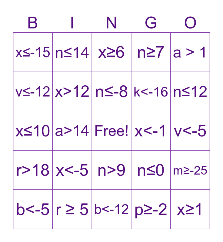 This bingo card has a free space and 24 words: x<-5, r ≥ 5, n≤-8, b<-5, a > 1, x≤-15, v≤-12, n≤14, x<-1, n>9, k<-16, x≤10, n≤0, m≥-25, x>12, p≥-2, v<-5, x≥6, n≤12, a>14, x≥1, r>18, n≥7 and b<-12.