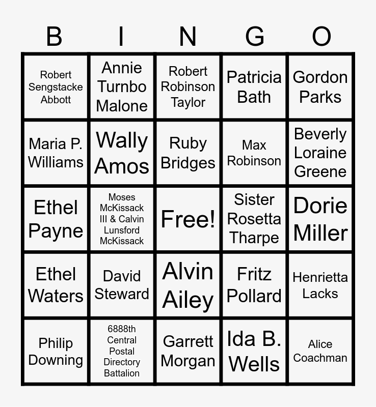 This bingo card has a free space and 24 words: David Steward, 6888th Central Postal Directory Battalion, Ruby Bridges, Philip Downing, Gordon Parks, Robert Sengstacke Abbott, Maria P. Williams, Annie Turnbo Malone, Sister Rosetta Tharpe, Alvin Ailey, Max Robinson, Ethel Payne, Fritz Pollard, Henrietta Lacks, Wally Amos, Ida B. Wells, Dorie Miller, Robert Robinson Taylor, Beverly Loraine Greene, Moses McKissack III & Calvin Lunsford McKissack, Alice Coachman, Ethel Waters, Patricia Bath and Garrett Morgan.