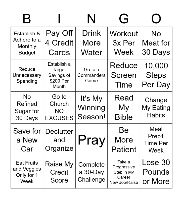 This bingo card has a free space and 24 words: Declutter and Organize, Raise My Credit Score, Go to a Commanders Game, Eat Fruits and Veggies Only for 1 Week, No Meat for 30 Days, Establish & Adhere to a Monthly Budget, Reduce Unnecessary Spending, Pay Off 4 Credit Cards, Read My Bible, Pray, Reduce Screen Time, No Refined Sugar for 30 Days, Be More Patient, Meal Prep1 Time Per Week, Establish a Target Savings of $200 Per Month, Take a Progressive Step in My Career New Job/Raise, Change My Eating Habits, Drink More Water, 10,000 Steps Per Day, Go to Church NO EXCUSES, Lose 30 Pounds or More, Save for a New Car, Workout 3x Per Week and Complete a 30-Day Challenge.