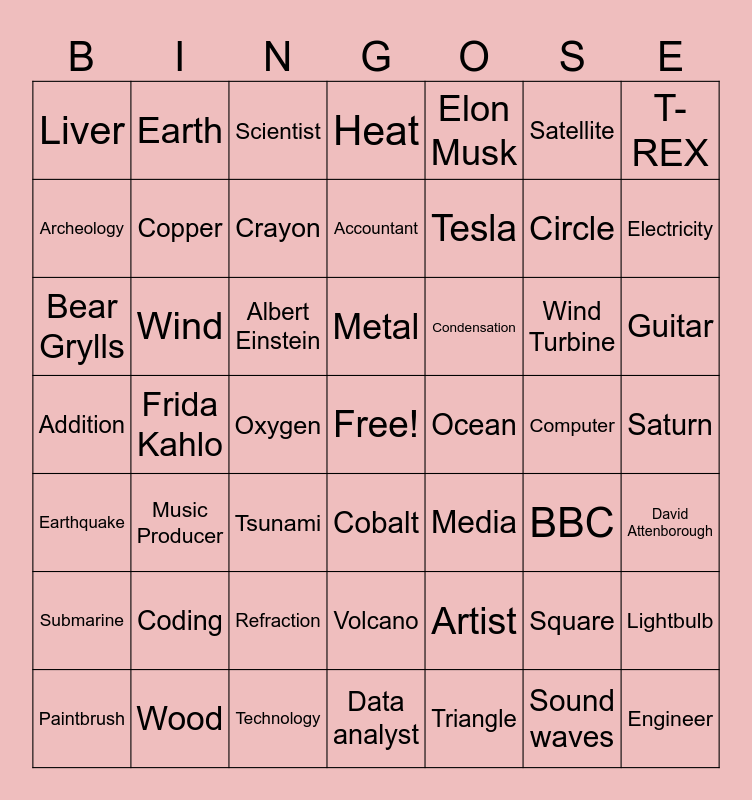 This bingo card has a free space and 49 words: Square, Circle, Triangle, Frida Kahlo, Albert Einstein, Saturn, Earth, Technology, Satellite, Cobalt, T-REX, Heat, Wind Turbine, Condensation, Coding, Computer, Archeology, Electricity, Lightbulb, Elon Musk, Tesla, Oxygen, Liver, Copper, Paintbrush, Crayon, Guitar, Wood, Metal, Wind, Fire, Ocean, Submarine, Refraction, Addition, Media, BBC, David Attenborough, Bear Grylls, Tsunami, Volcano, Earthquake, Engineer, Data analyst, Accountant, Scientist, Artist, Music Producer and Sound waves.