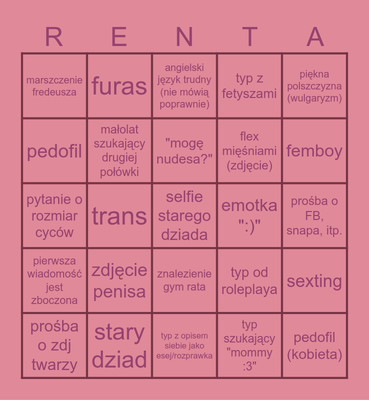 This bingo card has a free space and 24 words: zdjęcie penisa, stary dziad, "mogę nudesa?", prośba o zdj twarzy, piękna polszczyzna (wulgaryzm), marszczenie fredeusza, pedofil, furas, emotka ":)", znalezienie gym rata, flex mięśniami (zdjęcie), pytanie o rozmiar cyców, typ od roleplaya, sexting, małolat szukający drugiej połówki, typ szukający "mommy :3", prośba o FB, snapa, itp., angielski język trudny (nie mówią poprawnie), femboy, trans, pedofil (kobieta), pierwsza wiadomość jest zboczona, typ z fetyszami and typ z opisem siebie jako esej/rozprawka.