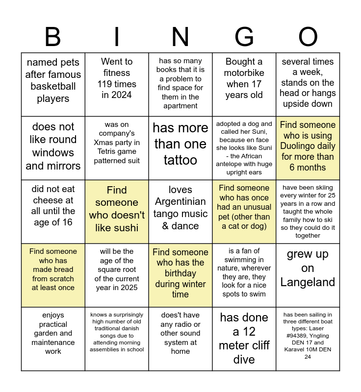 This bingo card has 25 words: Find someone who has made bread from scratch at least once, knows a surprisingly high number of old traditional danish songs due to attending morning assemblies in school, loves Argentinian tango music & dance, has done a 12 meter cliff dive, several times a week, stands on the head or hangs upside down, named pets after famous basketball players, Went to fitness 119 times in 2024, has so many books that it is a problem to find space for them in the apartment, Find someone who has once had an unusual pet (other than a cat or dog), grew up on Langeland, does not like round windows and mirrors, was on company's Xmas party in Tetris game patterned suit, does't have any radio or other sound system at home, is a fan of swimming in nature, wherever they are, they look for a nice spots to swim, Find someone who is using Duolingo daily for more than 6 months, enjoys practical garden and maintenance work, Find someone who doesn't like sushi, has more than one tattoo, adopted a dog and called her Suni, because en face she looks like Suni - the African antelope with huge upright ears, have been skiing every winter for 25 years in a row and taught the whole family how to ski so they could do it together, did not eat cheese at all until the age of 16, will be the age of the square root of the current year in 2025, Find someone who has the birthday during winter time, Bought a motorbike when 17 years old and has been sailing in three different boat types: Laser #94389, Yngling DEN 17 and Karavel 10M DEN 24.