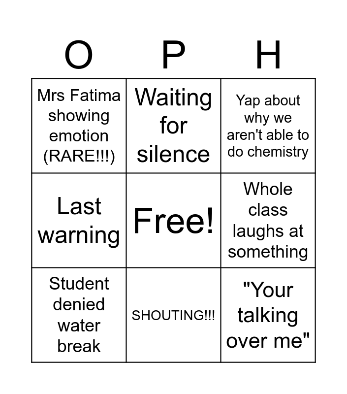 This bingo card has 1 images, a free space and 13 words: STOP TALKING!, Student relocation, Student denied water break, Waiting for silence, Last warning, "Your talking over me", Student hasn't finished writing down text on board, "Your behaviour is really bad", SHOUTING!!!, Mrs Fatima showing emotion (RARE!!!), Whole class laughs at something, Yap about why we aren't able to do chemistry and Only [x] hand?.