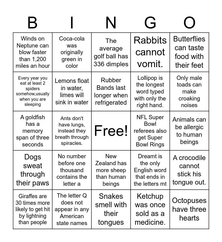 This bingo card has a free space and 29 words: Giraffes are 30 times more likely to get hit by lightning than people, The world's oldest dog lived to be 29.5 years old. Bluey was an Australian cattle dog, Ants don't have lungs, instead they breath through spiracles., A group of owls is called a parliament, Winds on Neptune can blow faster than 1,200 miles an hour, The average golf ball has 336 dimples, Lemons float in water, limes will sink in water, No number before one thousand contains the letter a, NFL Super Bowl referees also get Super Bowl Rings, The letter Q does not appear in any American state names, Animals can be allergic to human beings, Octopuses have three hearts, Snakes smell with their tongues, Ketchup was once sold as a medicine., Only male toads can make croaking noises, Russia has 11 time zones, New Zealand has more sheep than human beings, Dogs sweat through their paws, Butterflies can taste food with their feet, A goldfish has a memory span of three seconds, Dreamt is the only English word that ends in the letters mt, Stewardesses is the longest word typed with only the left hand, Lollipop is the longest word typed with only the right hand., Every year you eat at least 2 spiders somehow,usually when you are sleeping, Rabbits cannot vomit., Coca-cola was originally green in color, A crocodile cannot stick his tongue out., Rubber Bands last longer when refrigerated and You can't hum while holding your nose.