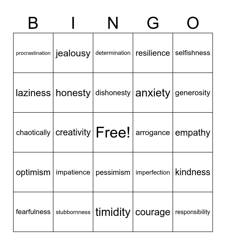 This bingo card has a free space and 24 words: impatience, stubbornness, dishonesty, fearfulness, selfishness, procrastination, laziness, jealousy, arrogance, pessimism, anxiety, chaotically, imperfection, kindness, honesty, courage, empathy, determination, generosity, creativity, responsibility, optimism, resilience and timidity.