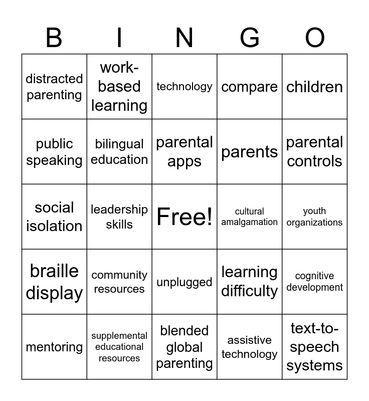 This bingo card has a free space and 24 words: community resources, supplemental educational resources, parental apps, mentoring, children, distracted parenting, public speaking, work-based learning, cultural amalgamation, unplugged, parents, social isolation, learning difficulty, cognitive development, bilingual education, assistive technology, youth organizations, technology, parental controls, leadership skills, text-to-speech systems, braille display, compare and blended global parenting.