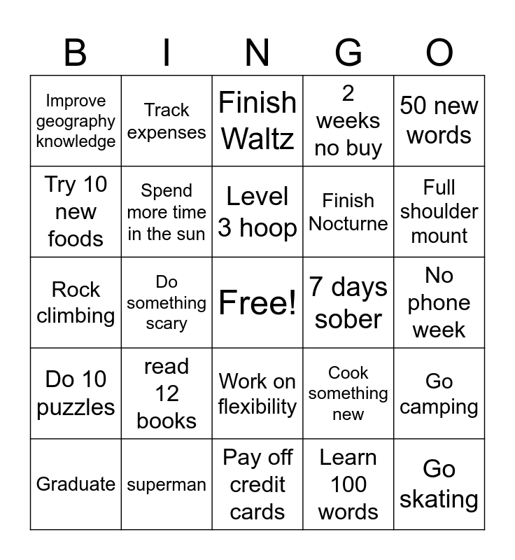 This bingo card has a free space and 24 words: read 12 books, superman, Level 3 hoop, Graduate, 50 new words, Improve geography knowledge, Try 10 new foods, Track expenses, 7 days sober, Work on flexibility, Finish Nocturne, Rock climbing, Cook something new, Go camping, Spend more time in the sun, Learn 100 words, No phone week, Finish Waltz, Full shoulder mount, Do something scary, Go skating, Do 10 puzzles, 2 weeks no buy and Pay off credit cards.