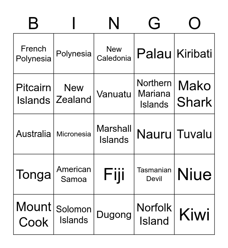 This bingo card has 40 words: Free!, Australia, Papua New Guinea, New Zealand, Solomon Islands, Fiji, Vanuatu, Samoa, Kiribati, Tonga, Micronesia, Palau, Marshall Islands, Tuvalu, Nauru, American Samoa, Cook Islands, French Polynesia, Guam, New Caledonia, Niue, Norfolk Island, Northern Mariana Islands, Pitcairn Islands, Tokelau, Easter Island, Koala, Kangaroo, Kiwi, Maori, Boomerang, Mount Cook, Great Barrier Reef, Tasmanian Devil, Mako Shark, Dugong, Outback, US Territory, Polynesia and Melanesia.