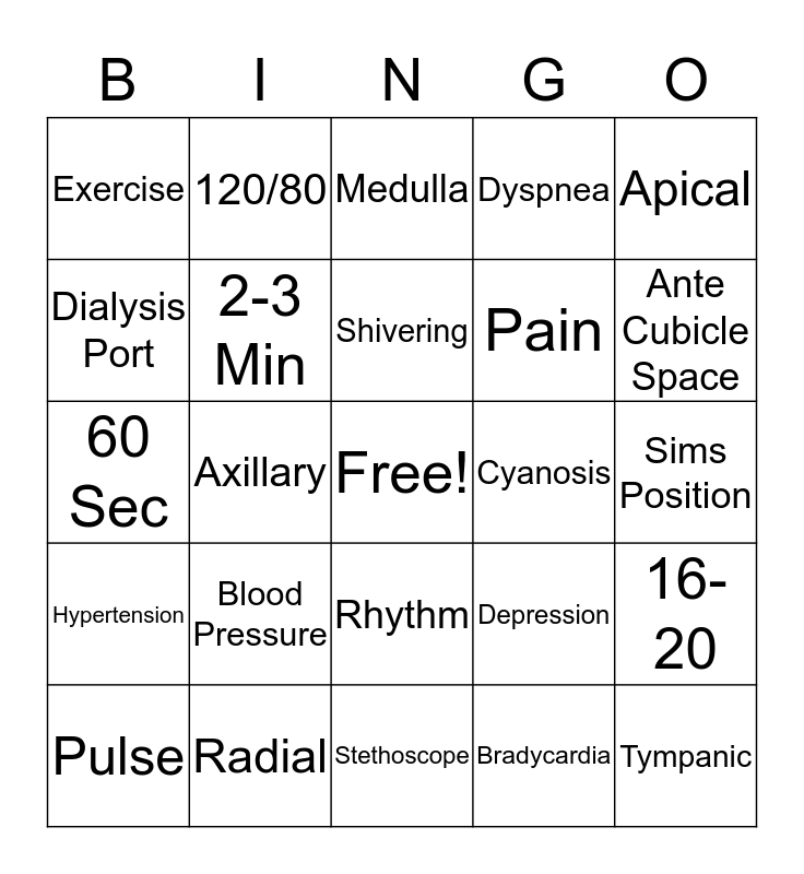 This bingo card has a free space and 24 words: Blood Pressure, Radial, Shivering, Pulse, Apical, Exercise, Dialysis Port, 120/80, Cyanosis, Rhythm, Pain, 60 Sec, Depression, 16-20, 2-3 Min, Bradycardia, Sims Position, Medulla, Ante Cubicle Space, Axillary, Tympanic, Hypertension, Dyspnea and Stethoscope.
