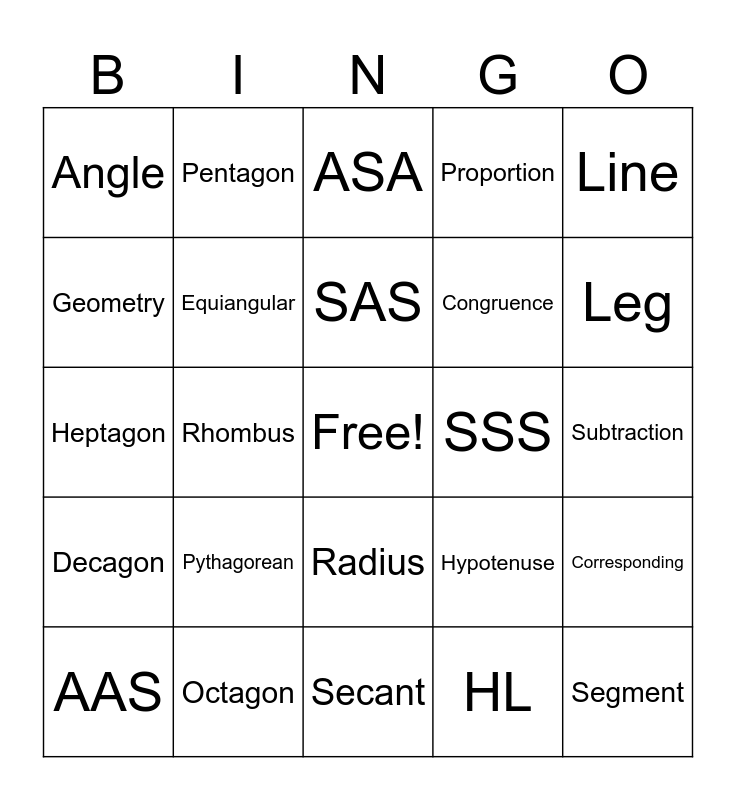This bingo card has a free space and 62 words: Equilateral, Octagon, Nonagon, Decagon, Statement, Reason, Equiangular, Parallelogram, Congruence, Similarity, Proportion, Mean, Geometry, Supplementary, Complementary, Angle, Segment, Line, Ray, SAS, SSS, ASA, AAS, HL, Parallel, Perpendicular, Interior, Exterior, Corresponding, Proof, Given, Transitive, Substitution, Addition, Subtraction, Pentagon, Rectangle, Square, Rhombus, Hexagon, Heptagon, Diagonal, Pythagorean, Triangle, Leg, Hypotenuse, Sine, Cosine, Tangent, Circle, Radius, Secant, Diameter, Chord, Volume, Area, Pyramid, Cylinder, Face, Base, Isosceles and Scalene.