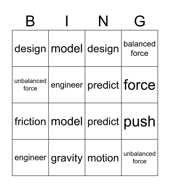 ⚠ This card has duplicate items: pull (2), push (2), force (2), balanced force (2), unbalanced force (2), design (2), engineer (2), model (2), motion (2), gravity (2), friction (2), predict (2), pattern (2)